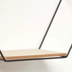 Rustic style wall mounted shelves, crafted from strong black metal and wood. These sturdy shelves are surrounded by a hexagonal shaped black metal frame and are ideal for styling in living spaces and bedrooms. Perfect for housing ornaments, picture frames, candles and small plants use as a set on one wall or individually around the home.