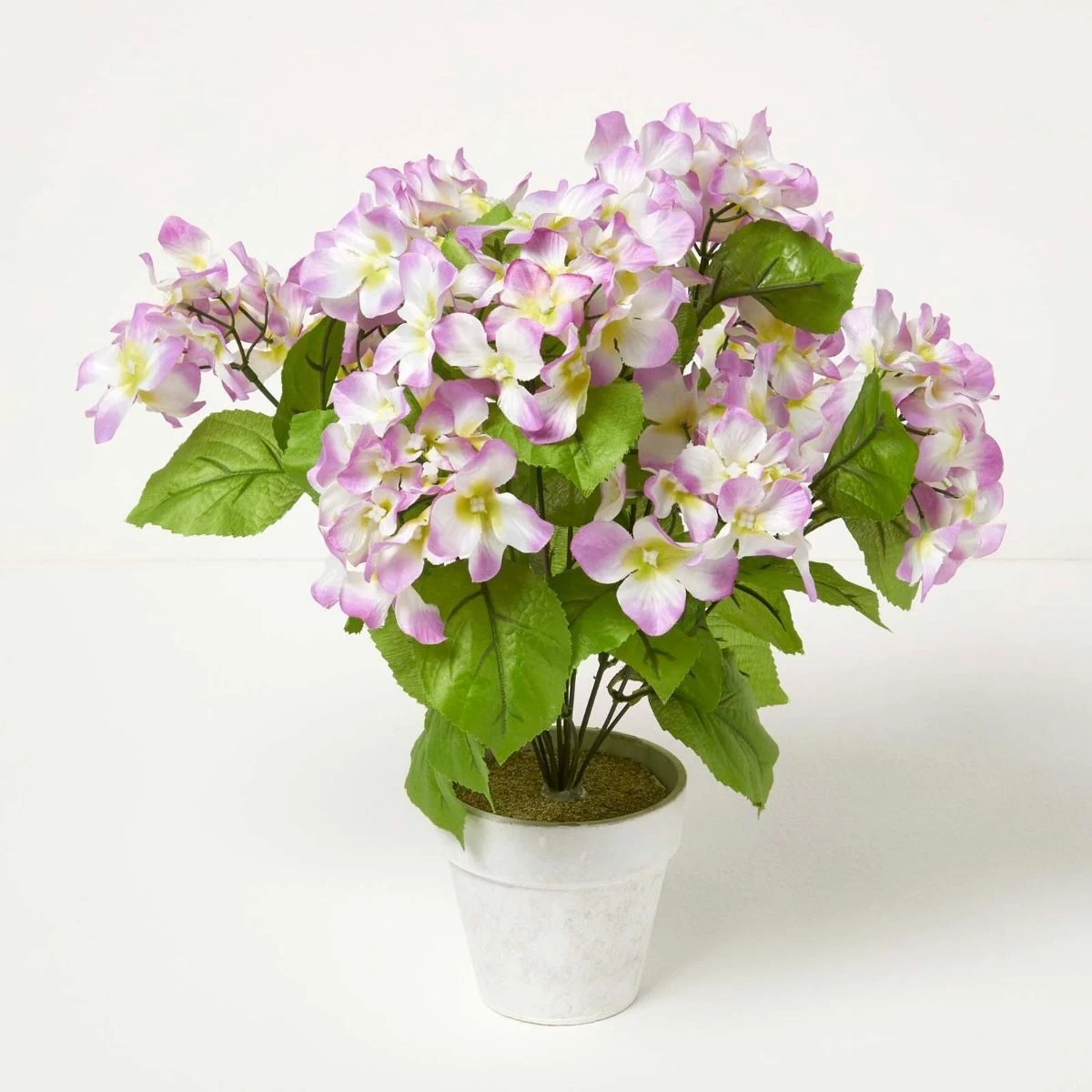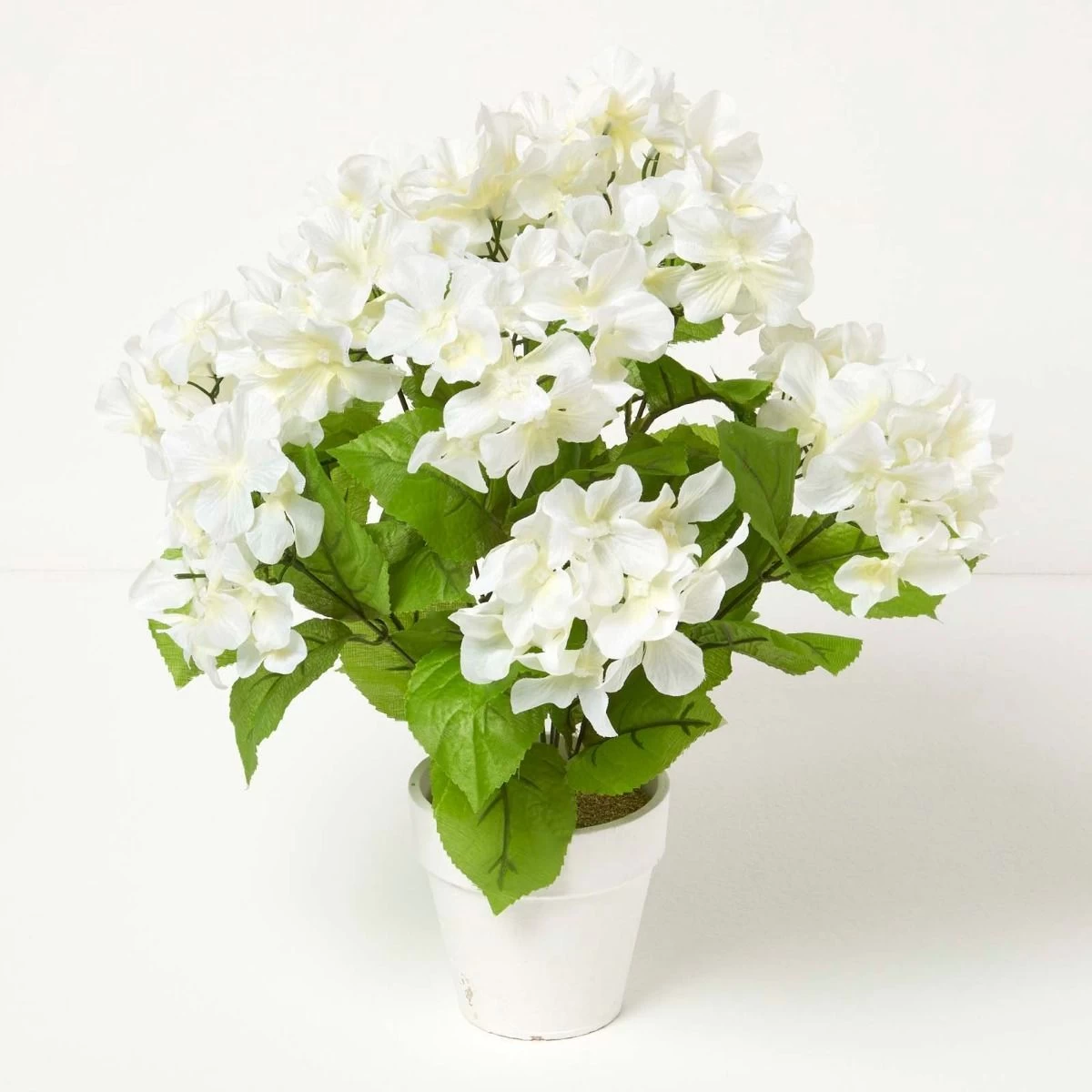 Faux Hydrangea in a decorative pot. Lifelike and easy to maintain, these artificial Hydrangeas have been handcrafted with detail for botanical accuracy.