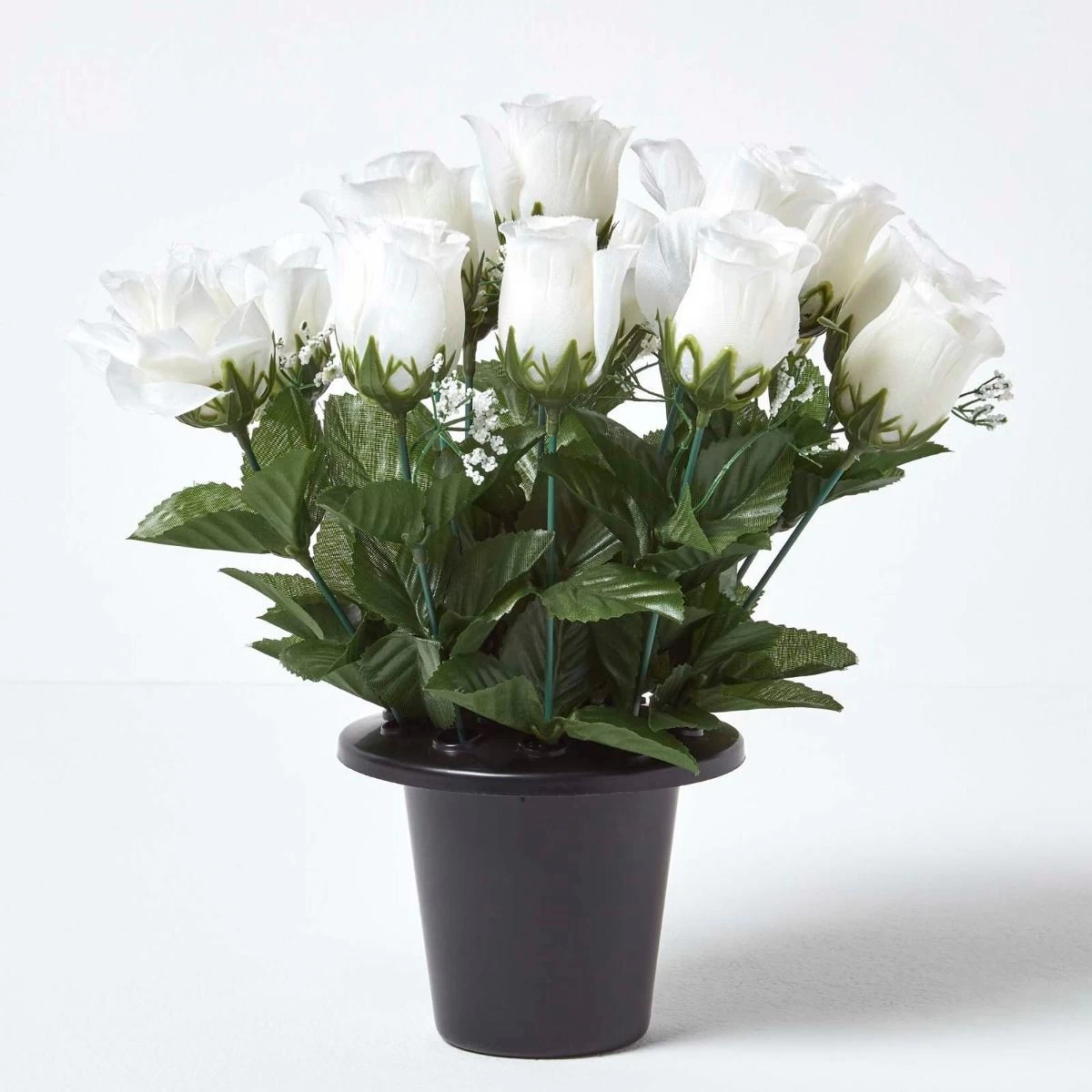 Realistic looking set of artificial grave pots from Homescapes featuring red, pink and white roses. A perfect addition to your loved ones grave. Each measures approximately 28 cm.