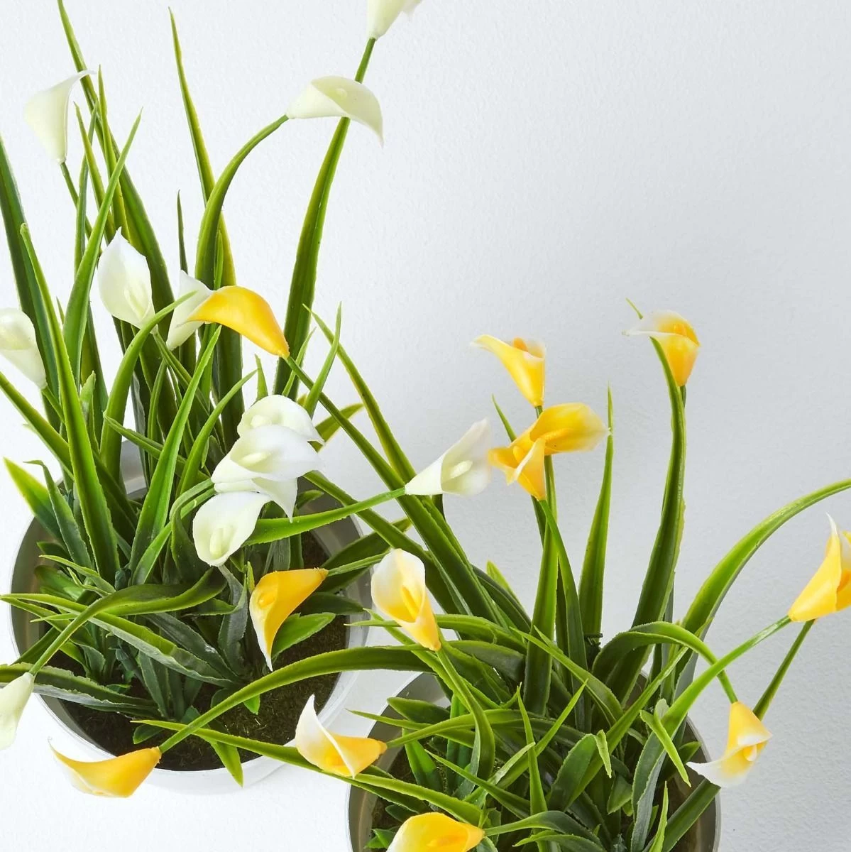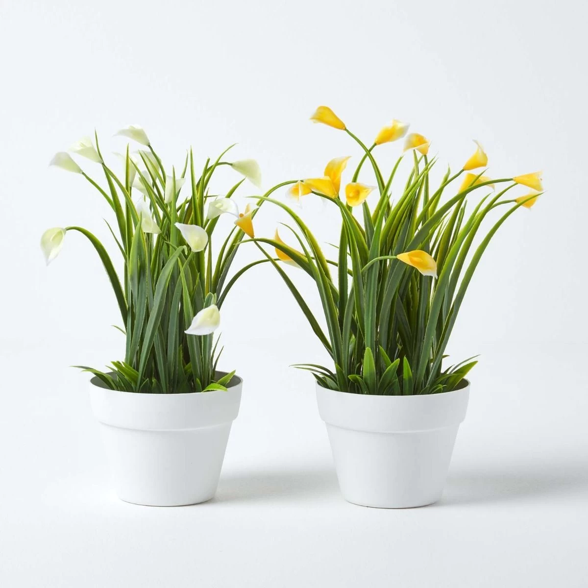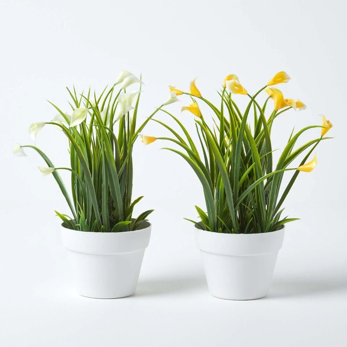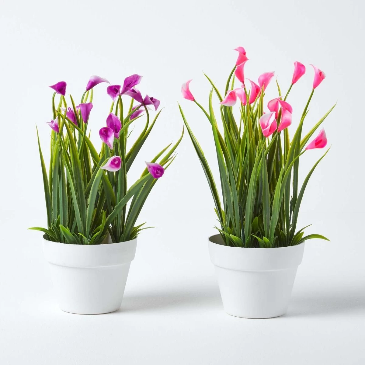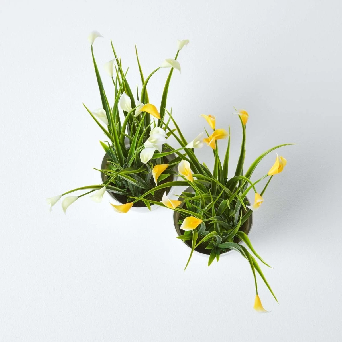 Set of four artificial plants from Homescapes, including one purple, one yellow, one white and one pink artificial calla lily. To add a floral touch to your home interiors, these faux plants are set inside a white plastic pot so you can display straight away or place inside your own planter.