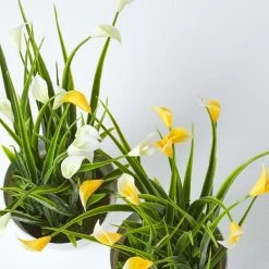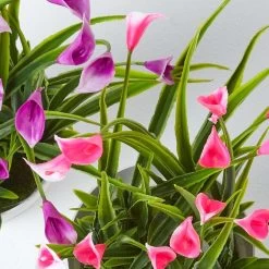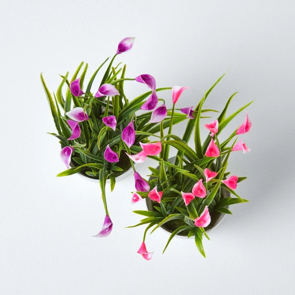Set of four multi-coloured artificial calla lily from Homescapes. These artificial plants are set inside a white decorative pot and measure 25 cm in height.