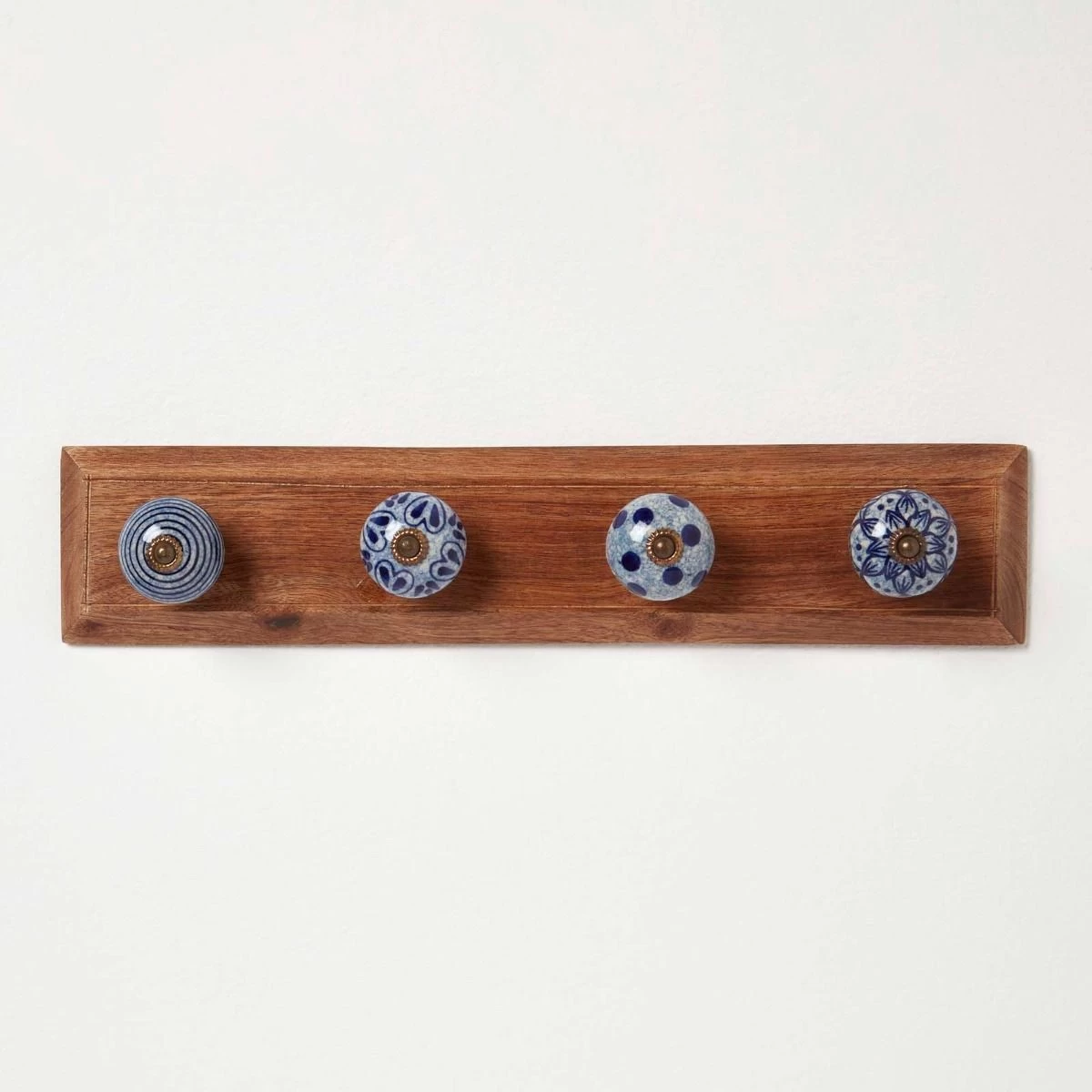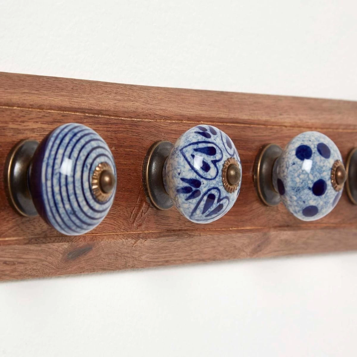 Decorative blue and white hat hooks on a solid wooden base. This cottagecore coat hooks set includes four hangers and is ideal for hallways and utility rooms.