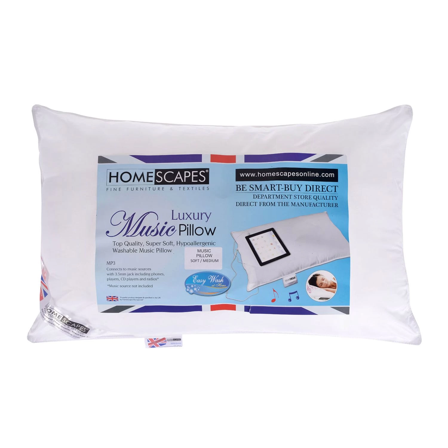 This quality music pillow is made with a high density, 100% Microfibre, anti-dust mite casing and a light and a spongy, hypoallergenic Super Microfibre filling to support your head and neck. With a soft-medium firmness, this pillow is best suited for front and back sleepers.