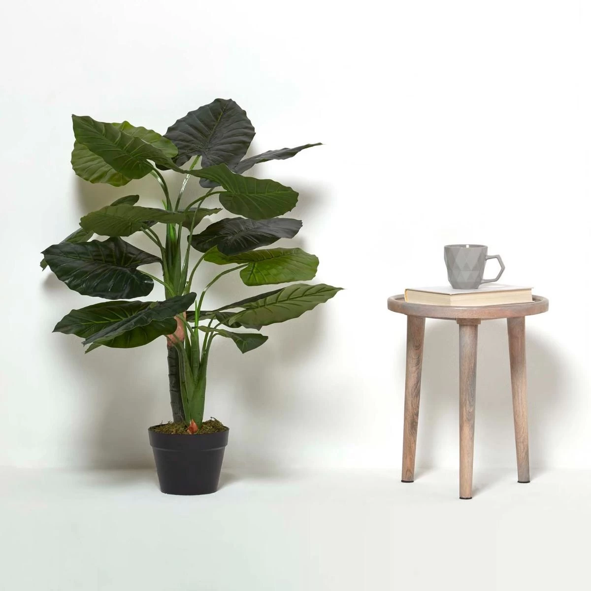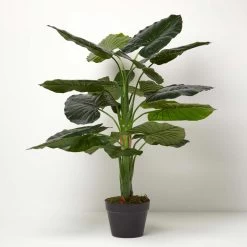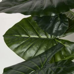 A lifelike fake taro plant measuring 90 cm tall. This versatile plant features an array of large v-shaped leaves, is hand carved from a durable polyfibre and finished in a deep green colour. Just like the real thing, it sits on a replica stem and will remain vibrant all year through. Style among other artificial and real plants to create the perfect look. With is cluster of large green leaves, this faux plant is also known as an elephant ear plant, this vibrant green faux plant will add a touch of greenery to any home.