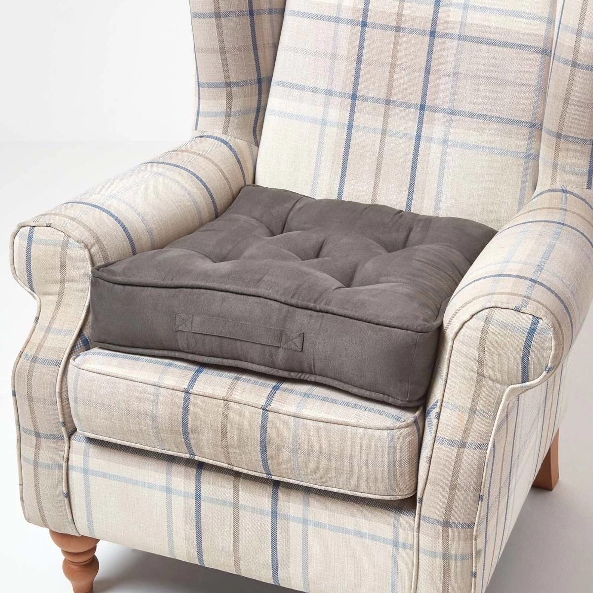 Taupe Grey faux suede armchair booster cushion, supportive armchair cushion with thick foam filling and carry handle provides lasting support whilst sitting.