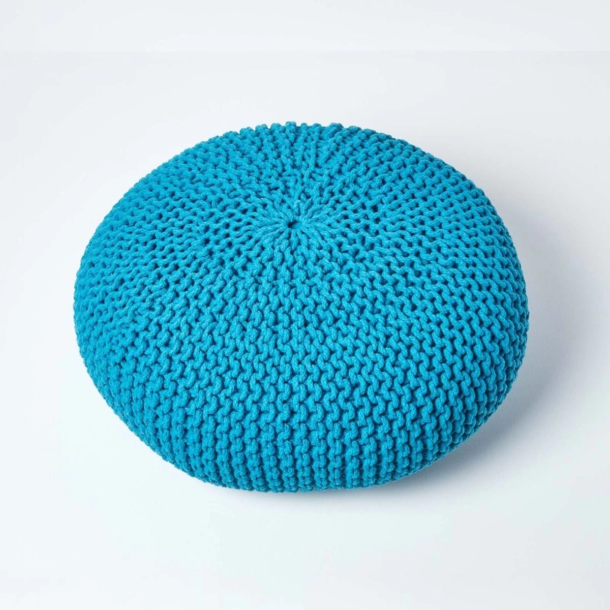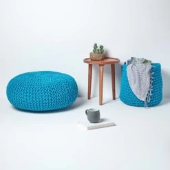 Handcrafted round knitted pouffe in colourful teal blue. Measuring 70 cm wide and 23 cm tall, this 100% cotton chunky knitted circular pouffe is ideal as an occasional seat.