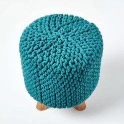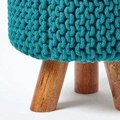 Colourful teal blue knitted footstool measuring 42 cm tall with 3 wooden legs. Handwoven in 100% cotton, this chunky knitted pouffe can be used as a footrest or occasional seat.