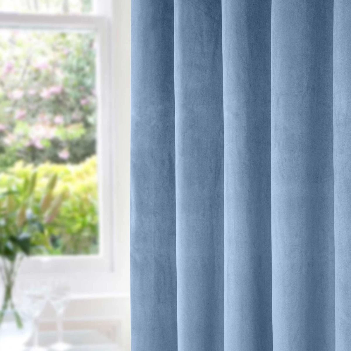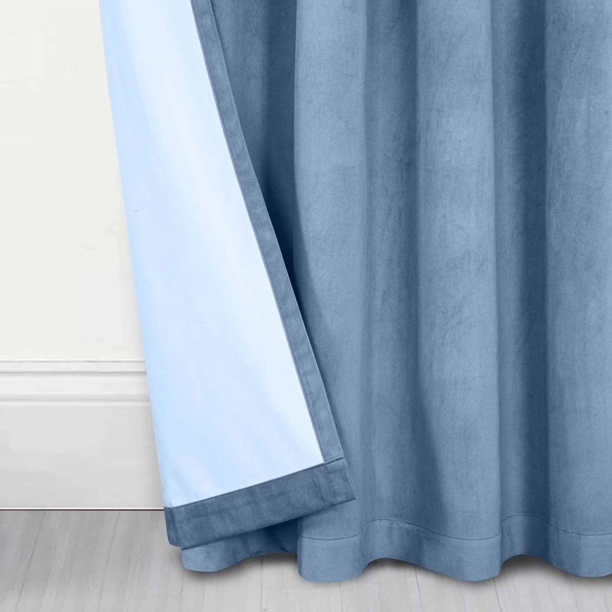 Super soft and thick blue blackout velvet curtains with 100% blackout lining. Crafted from exclusive 3-pass coating technology, these genuine blackout curtains block out sunlight and artificial lighting, keeping your room pitch black, ensuring complete privacy and allowing you to get the perfect night’s rest. Comprising of a soft and textured velvet fabric, blackout coating and a flocking layer this patented technology is unlike any other and will provide genuine blackout throughout the year. A versatile curtain that can be used in living rooms and bedrooms, these velvet curtains also possess outstanding thermal qualities, protecting against heat loss and heat gain and reducing energy costs during colder months.