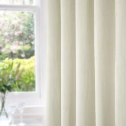 Super soft and thick cream blackout velvet curtains with 100% blackout lining. Crafted from exclusive 3-pass coating technology, these genuine blackout curtains block out sunlight and artificial lighting, keeping your room pitch black, ensuring complete privacy and allowing you to get the perfect night’s rest. Comprising of a soft and textured velvet fabric, blackout coating and a flocking layer this patented technology is unlike any other and will provide genuine blackout throughout the year. A versatile curtain that can be used in living rooms and bedrooms, these velvet curtains also possess outstanding thermal qualities, protecting against heat loss and heat gain and reducing energy costs during colder months.