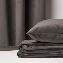 Heavy weighted to ensure the perfect drape, these blackout velvet curtains will frame windows and doors perfectly and feature an eyelet header, suitable for use on a curtain pole. A textured curtain in a rich grey colour, they will complement both modern and traditional styles and can be paired with similar neutral tones as well as bold colours to create your perfect look. Available in 6 standard sizes, this blackout curtain collection is accompanied by a range of coordinating throws and cushions available in a range of sizes.