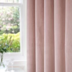 Luxuriously soft thermal blackout pink velvet curtains with 3-Pass coated technology ensuring that sunlight is 100% blacked out, eyelet velvet curtains available in 6 sizes.
