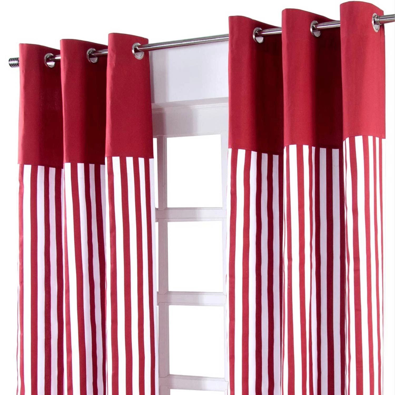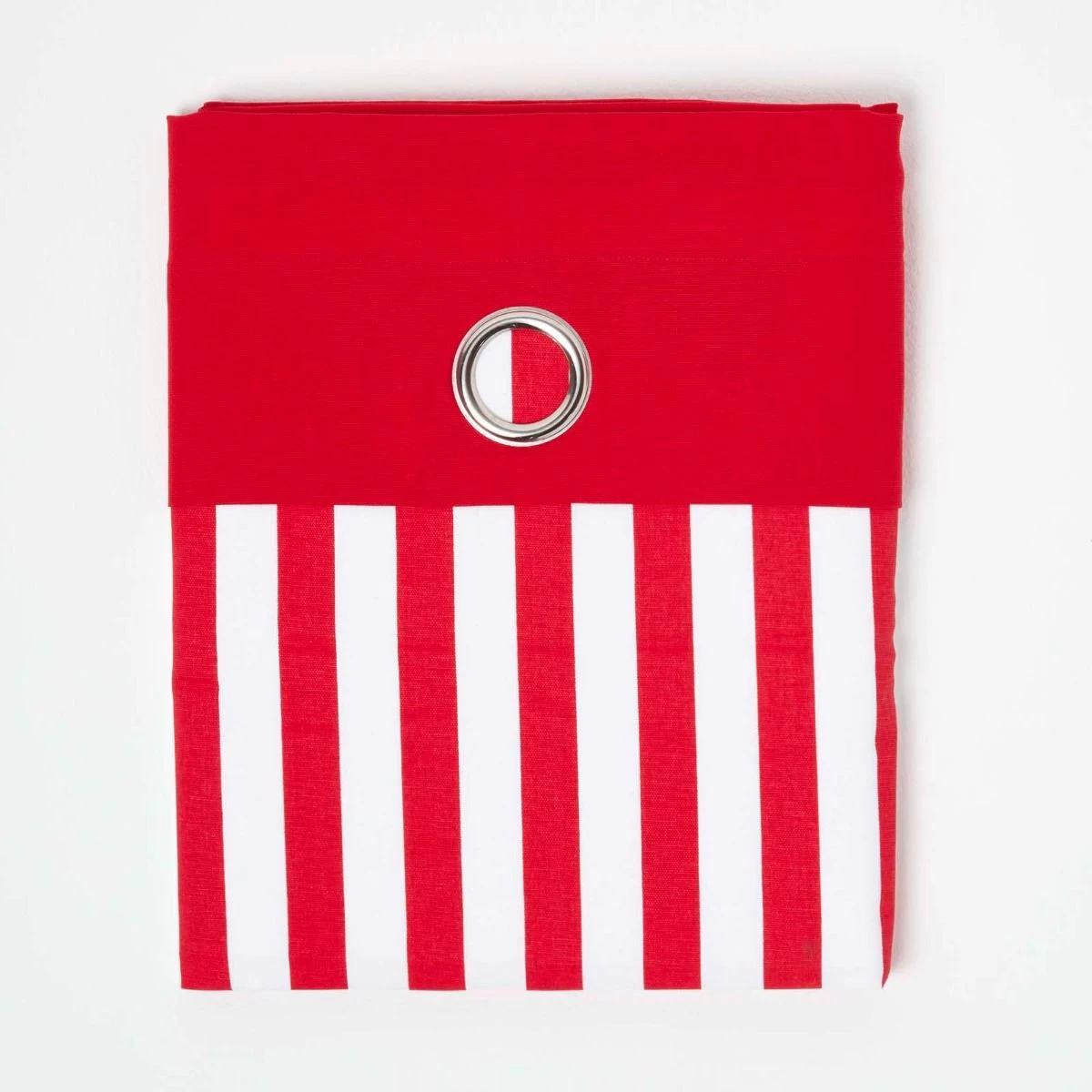 These stylish Thick Red Stripe Eyelet Curtains are the ideal way for you to revamp any room and add a contemporary flair. The vivid red stripes and patchwork panels contrast perfectly with the pure white stripes, and these curtains are sure to renovate the look of any room. These chic Thick Red Stripe Curtains are one pair in Homescapes impressive range of pure cotton designer curtains in many charming designs and soft prints. Our modern ring top or eyelet curtains are made with heavy cotton fabric and a wide range of colours, which allows our curtains to coordinate well with almost any interior setting and the vivid colours used are able to uplift the mood of any room. These curtains are suitable for all spaces, and would fit perfectly in the kids rooms due to their refreshing print. Please note, these curtains are not lined and so they will have to be used in conjunction with a black out curtains in order to make them light proof. Coordinating fabric (to make your own soft furnishings), cushions and floor cushions are also available with Homescapes.