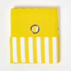These chic Thick Yellow Stripe Eyelet Curtains are the perfect way for you to renovate any room and add a fashionable flair. The sunny yellow stripes and patchwork panels contrast wonderfully with the pure white stripes, and these curtains are sure to revamp the look of any room. These stylish Thick Yellow Stripe Curtains are one pair in Homescapes impressive range of pure cotton designer curtains in many charming designs and soft prints. Our modern ring top or eyelet curtains are made with heavy cotton fabric and a wide range of colours, which allows our curtains to coordinate well with almost any interior setting and the vivid colours used are able to uplift the mood of any room. These curtains are suitable for all spaces, and would fit perfectly in the kids rooms due to their refreshing print. Please note, these curtains are not lined and so they will have to be used in conjunction with a black out curtains in order to make them light proof. Coordinating fabric (to make your own soft furnishings), cushions and floor cushions are also available with Homescapes.