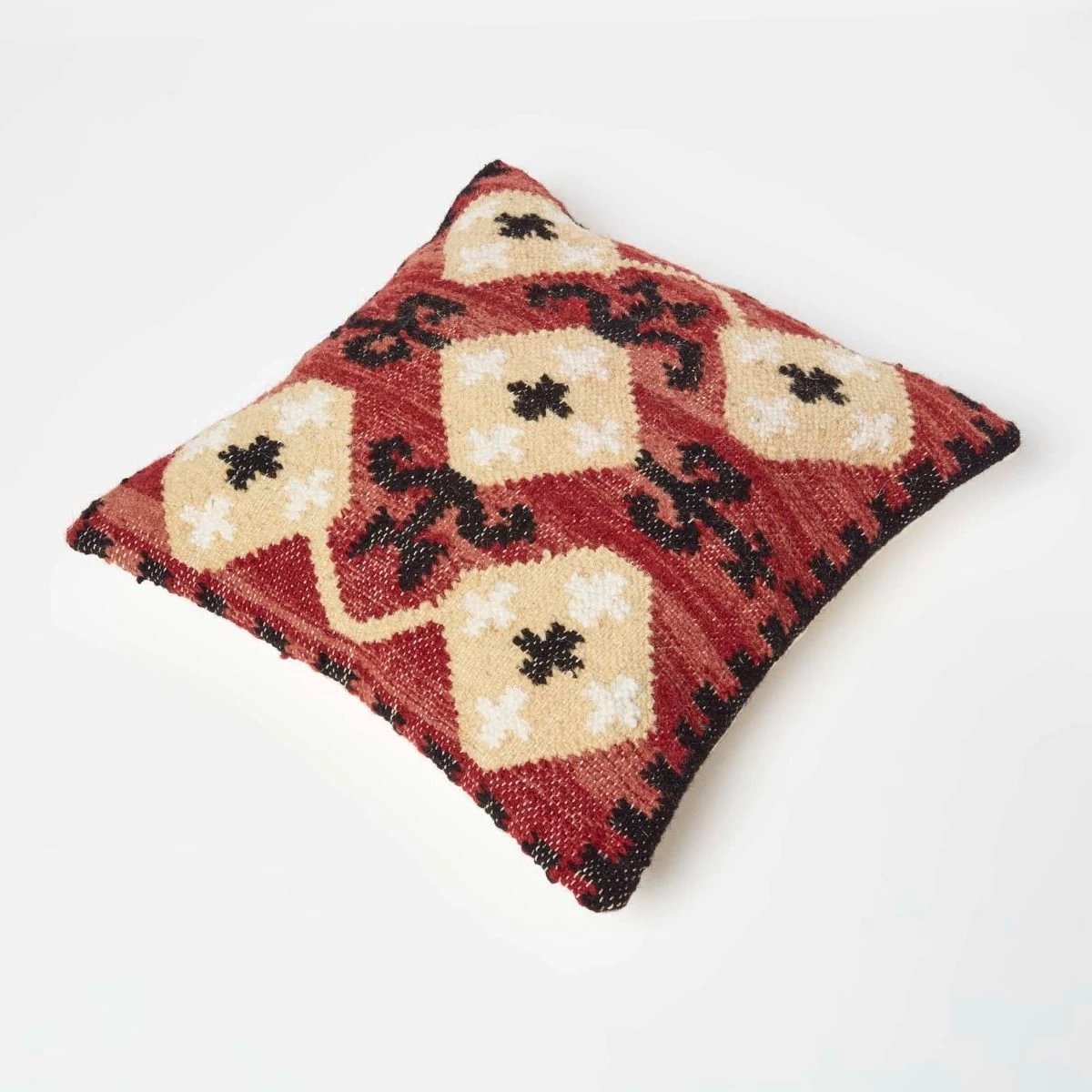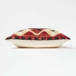 Traditional red and yellow handwoven kilim cushion, a colourful textured cushion handcrafted from pure wool and cotton and featuring a geometric style design.