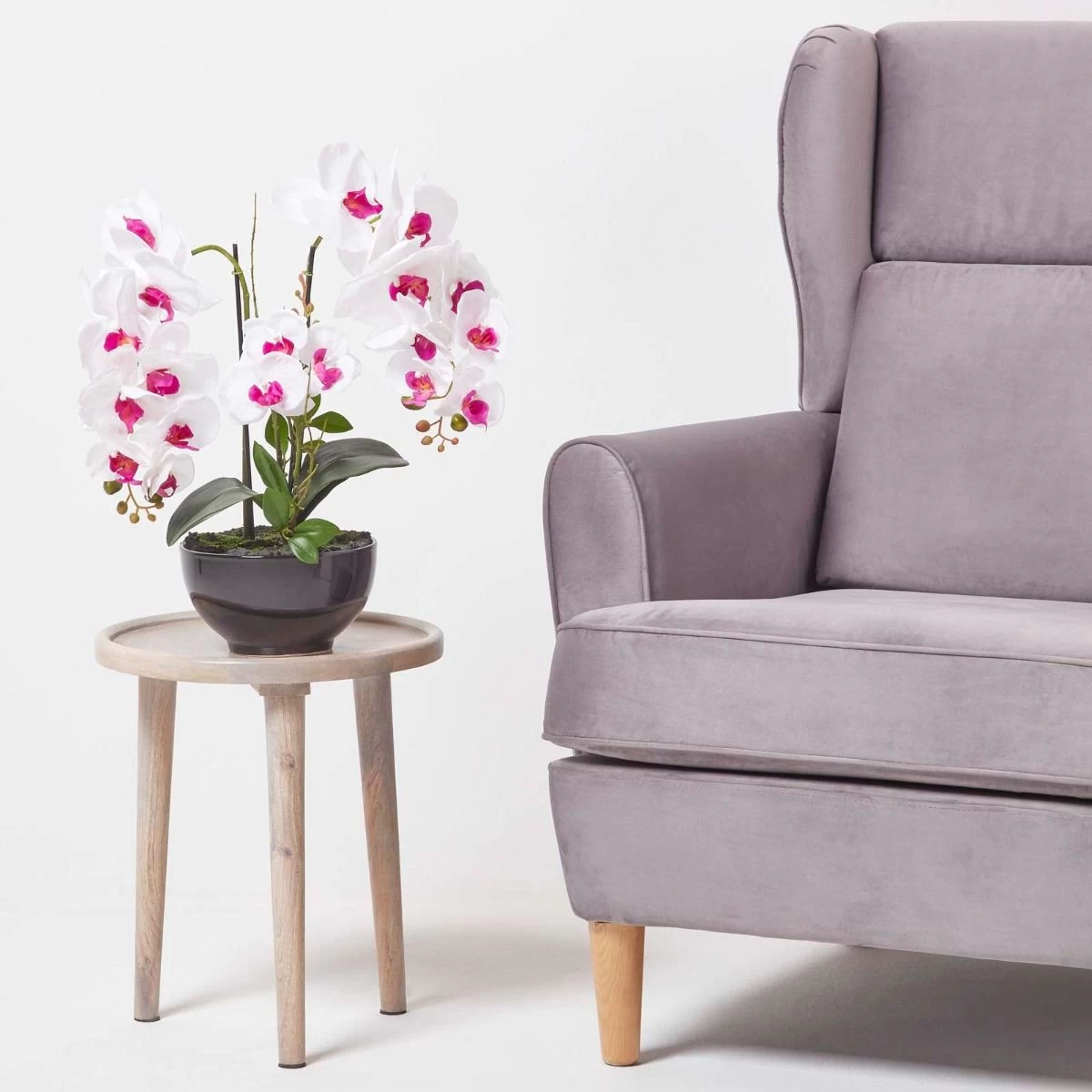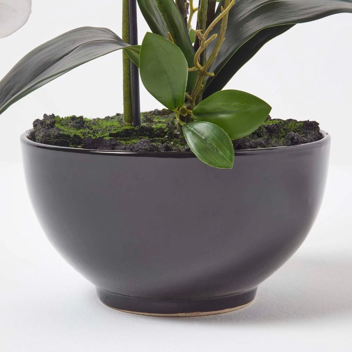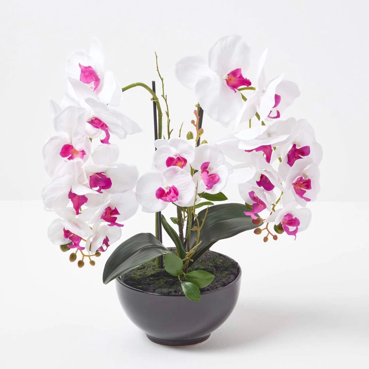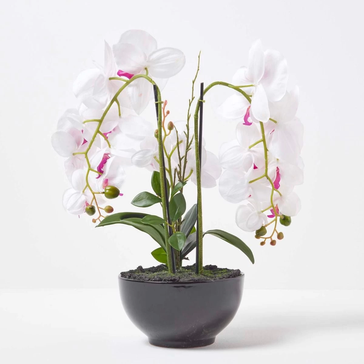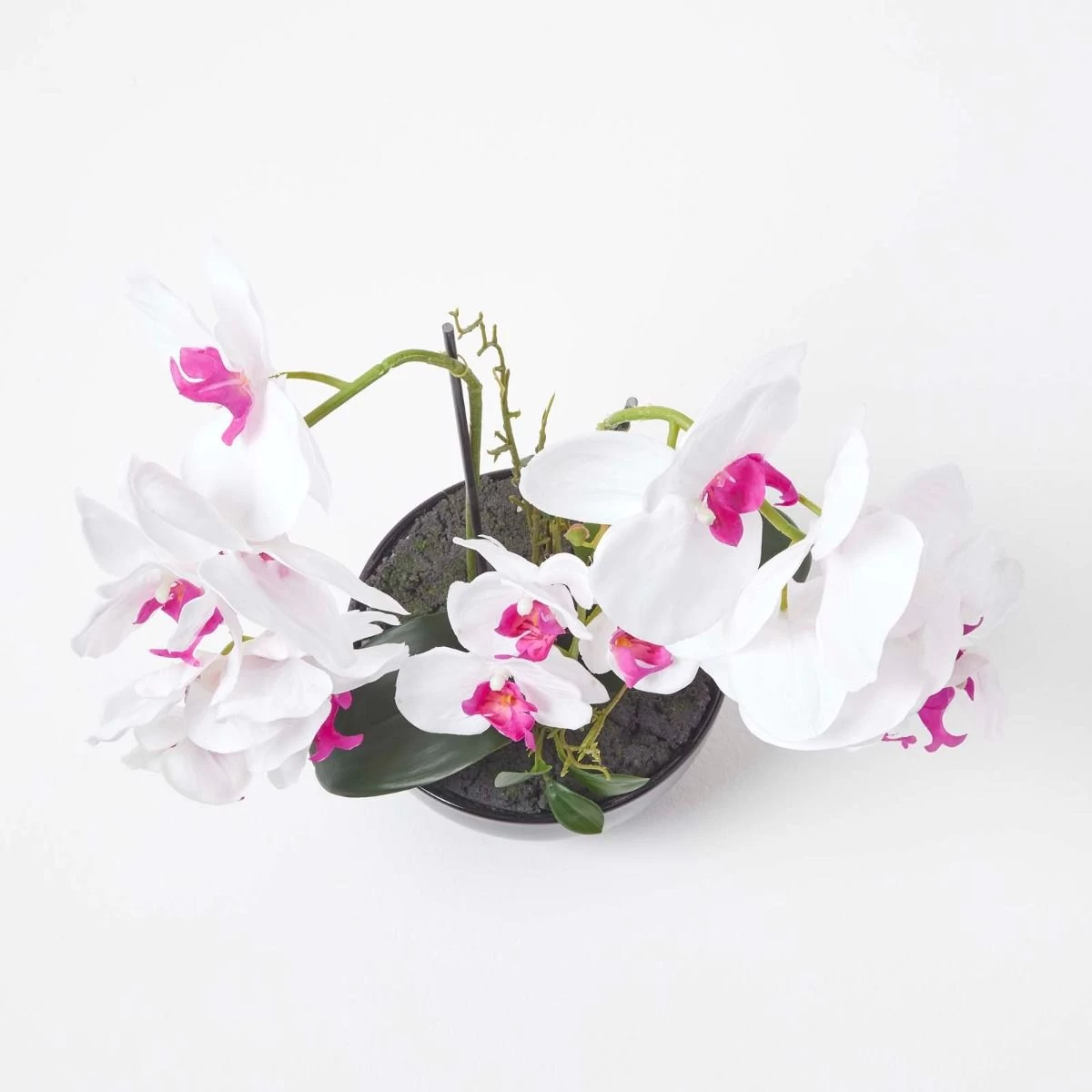 Oriental Phalaenopsis white and pink artificial orchid from Homescapes in a decorative black ceramic bowl, ideal for adding style to contemporary interiors.