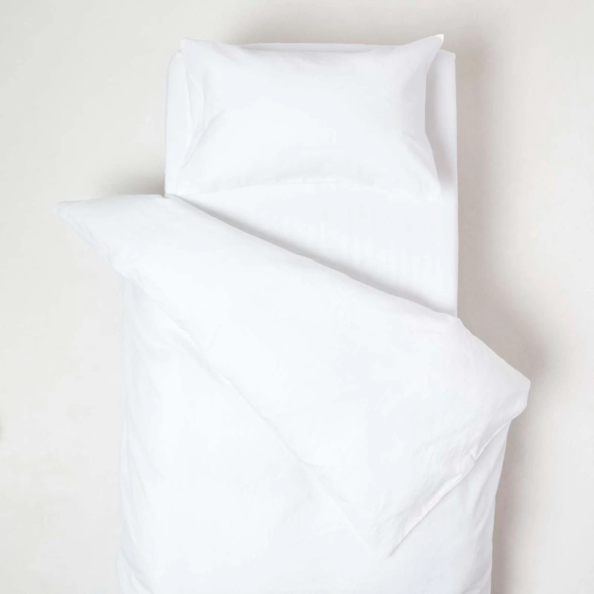 White cot bed duvet cover from Homescapes’ children’s bed linen range. Toddler duvet set with matching pillowcase woven from a premium blend of cotton and linen.