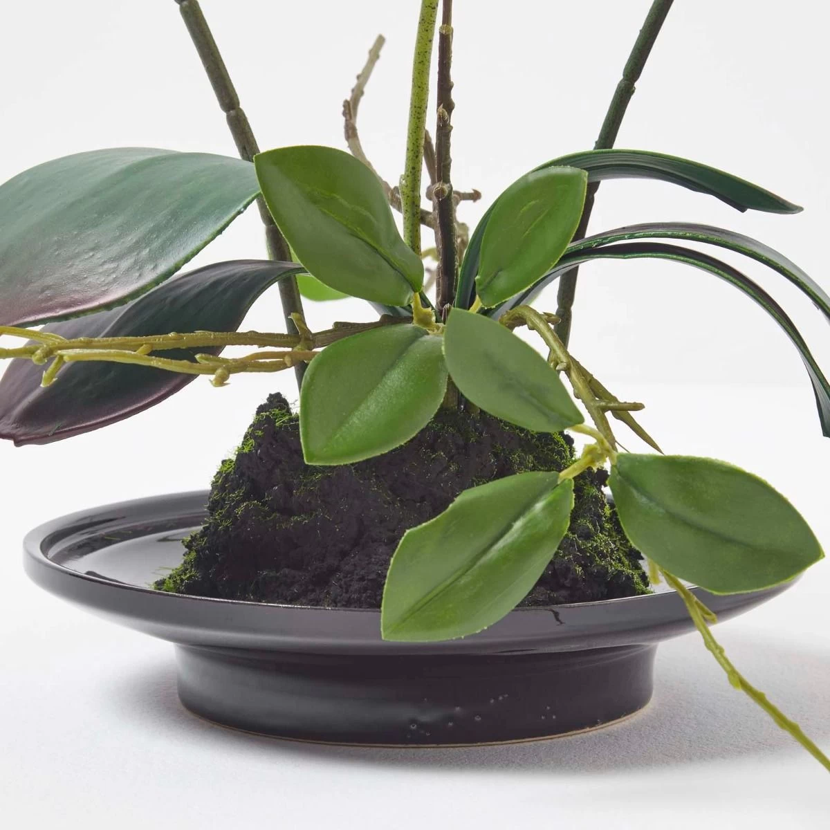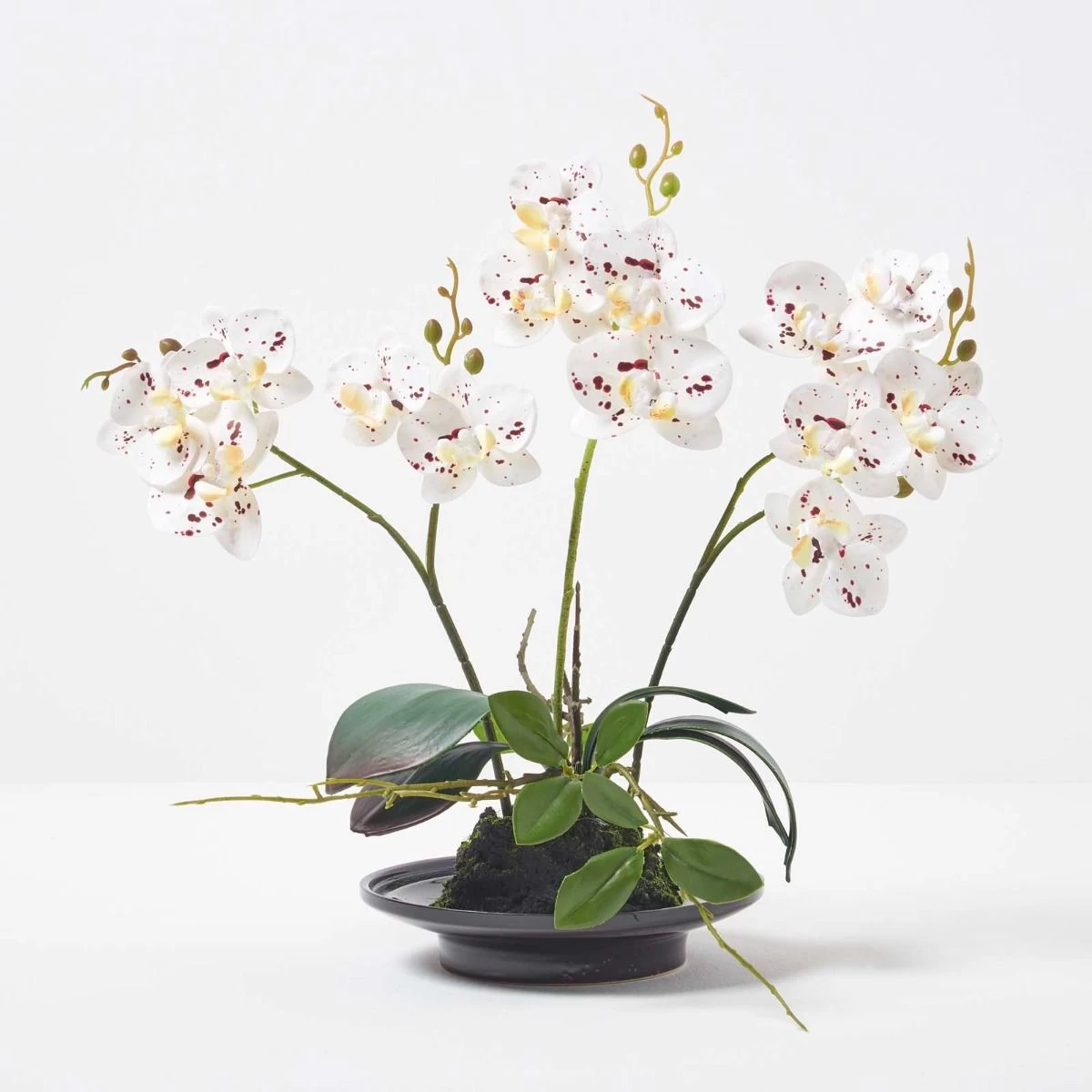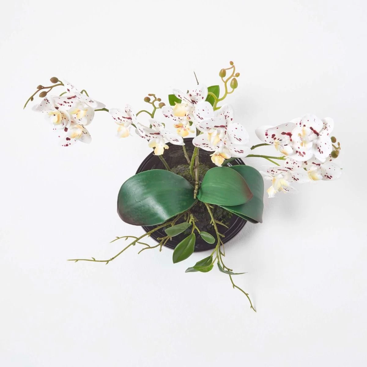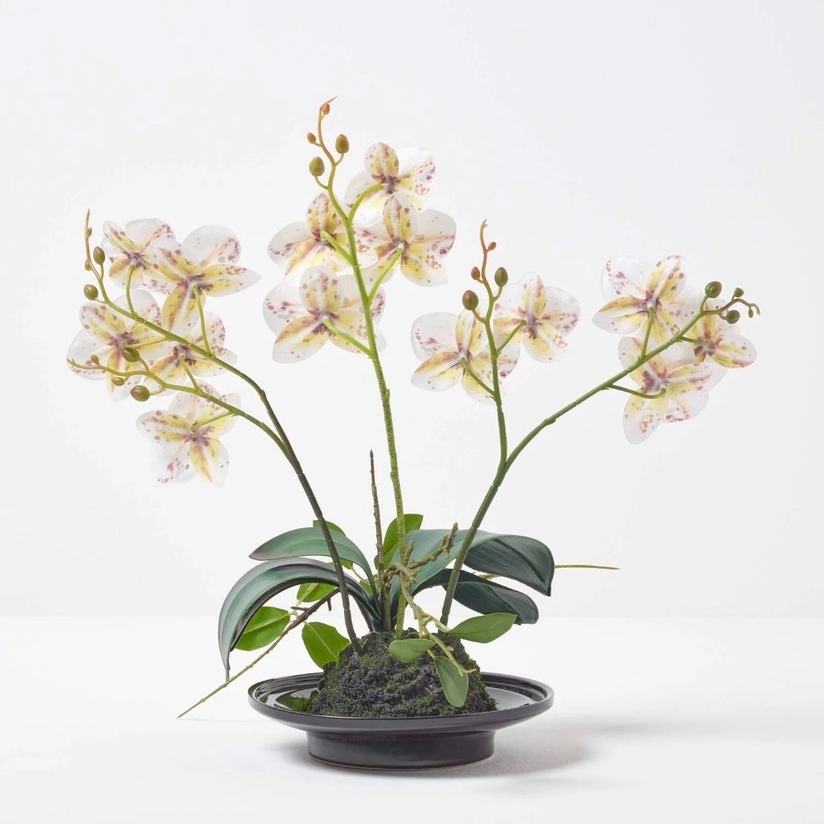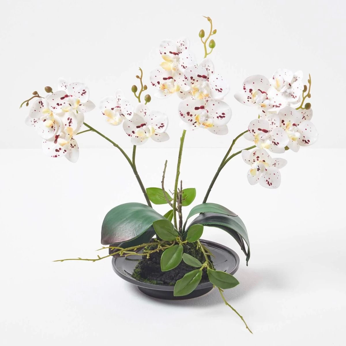 Stunning oriental white speckled Phalaenopsis artificial orchid from Homescapes in a decorative black ceramic bowl, ideal for adding style to contemporary interiors.