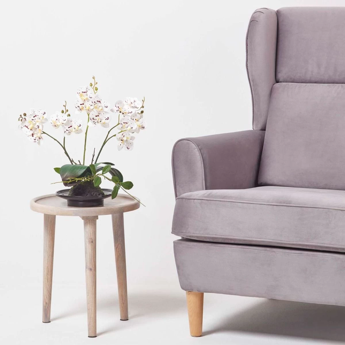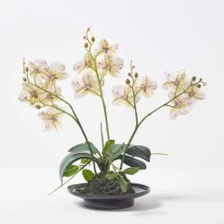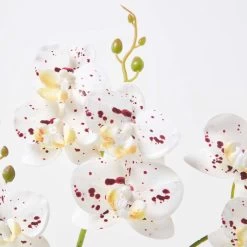 Crafted from silk-like polyester for botanical accuracy, this fake white orchid plant is perfect for adding style to your office or home to brighten up living spaces. This delicate plant features stunning white flowers with speckled pink petals making them look realistic and stylish. With lifelike stems, soil and leaves this artificial white orchid can be arranged to your liking and is just like the real thing.