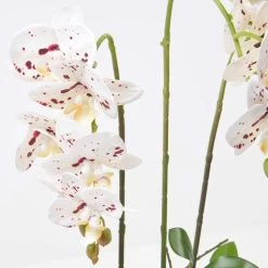 Crafted from silk-like polyester for botanical accuracy, this fake white orchid plant is perfect for adding style to side tables or windowsills to brighten up living spaces. This delicate plant features stunning white artificial orchid flowers with speckled pink petals making them look realistic and stylish. With lifelike stems, soil and leaves this artificial white orchid can be arranged to your liking and is just like the real thing.