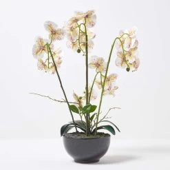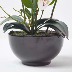 Stunning oriental white Phalaenopsis artificial orchid from Homescapes with realistic artificial orchid flowers in a decorative ceramic bowl, for added style to interiors.