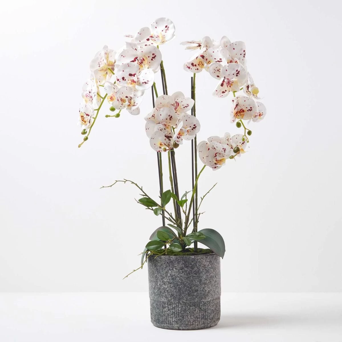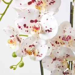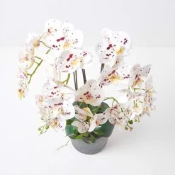 Crafted from silk-like polyester for botanical accuracy, this artificial white orchid is perfect for adding style to side tables or windowsills to brighten up living spaces. This delicate plant features stunning white artificial orchid flowers with speckled pink petals making them look realistic and stylish. With lifelike stems, soil and leaves this artificial orchid can be arranged to your liking and is just like the real thing.