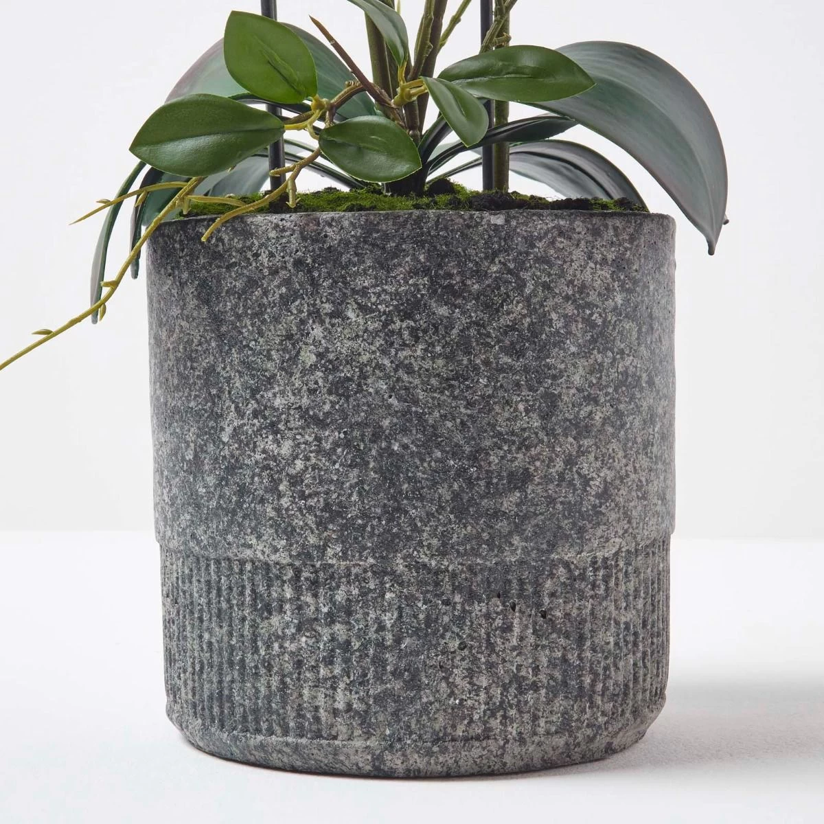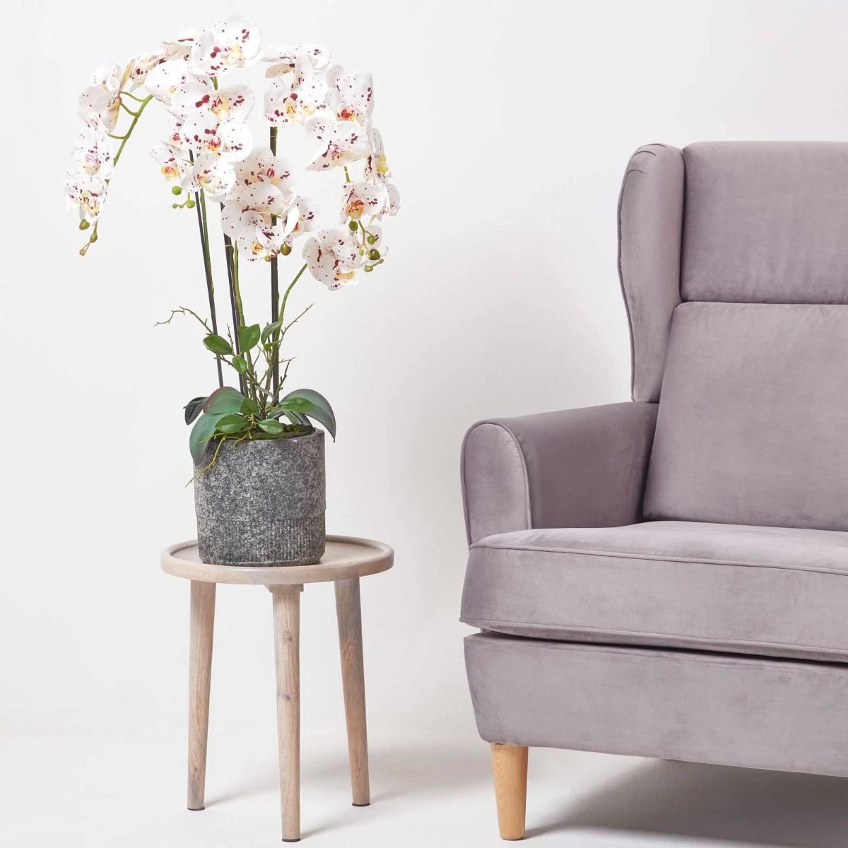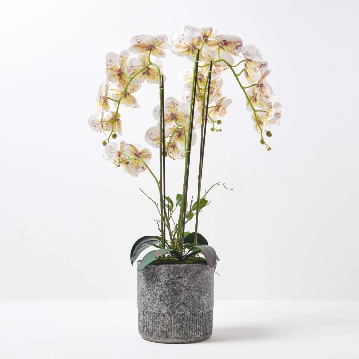 Measuring 82 cm tall, handcrafted by skilled experts and UV treated to ensure lasting colour, this faux plant looks both realistic and lifelike. Sat in a traditional grey cement pot for added style to rustic interiors, this fake orchid plant is easy to care for, simply dust with a damp cloth regularly and keep out of direct sunlight. Mix and match from our range of plants to add decoration in your home.