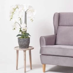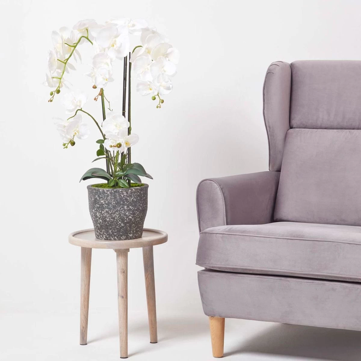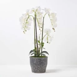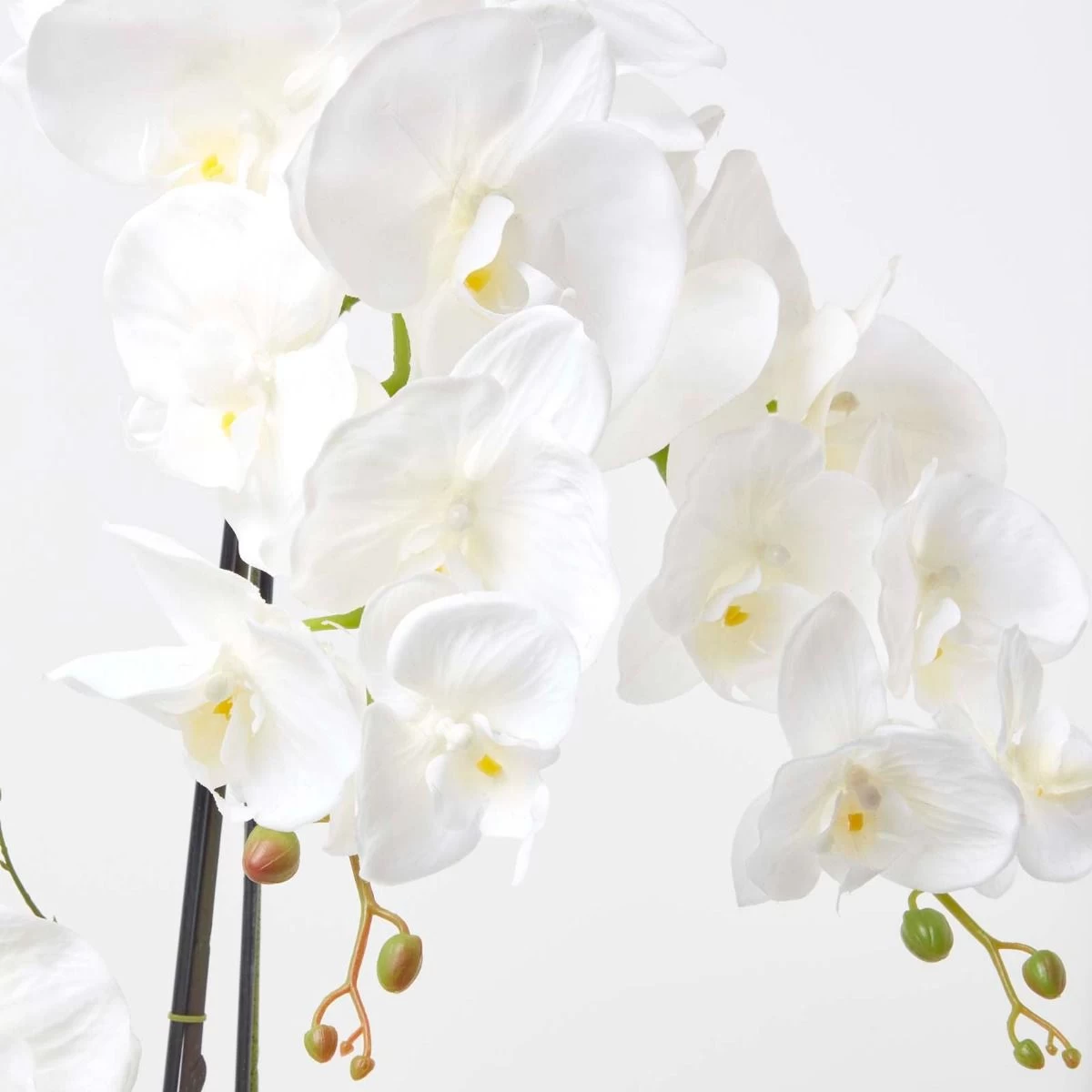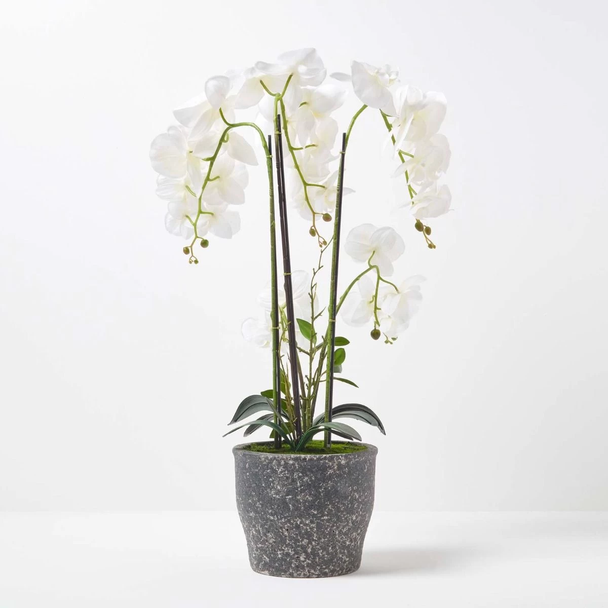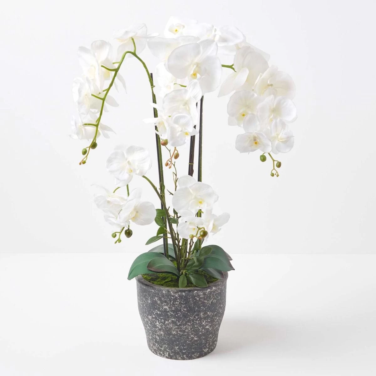 Beautiful giant Phalaenopsis white artificial orchid from Homescapes in a decorative dark ceramic pot, ideal for adding style to contemporary interiors.