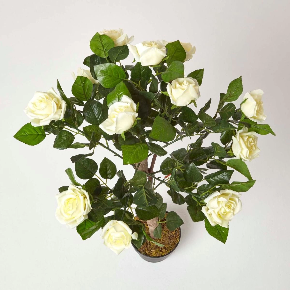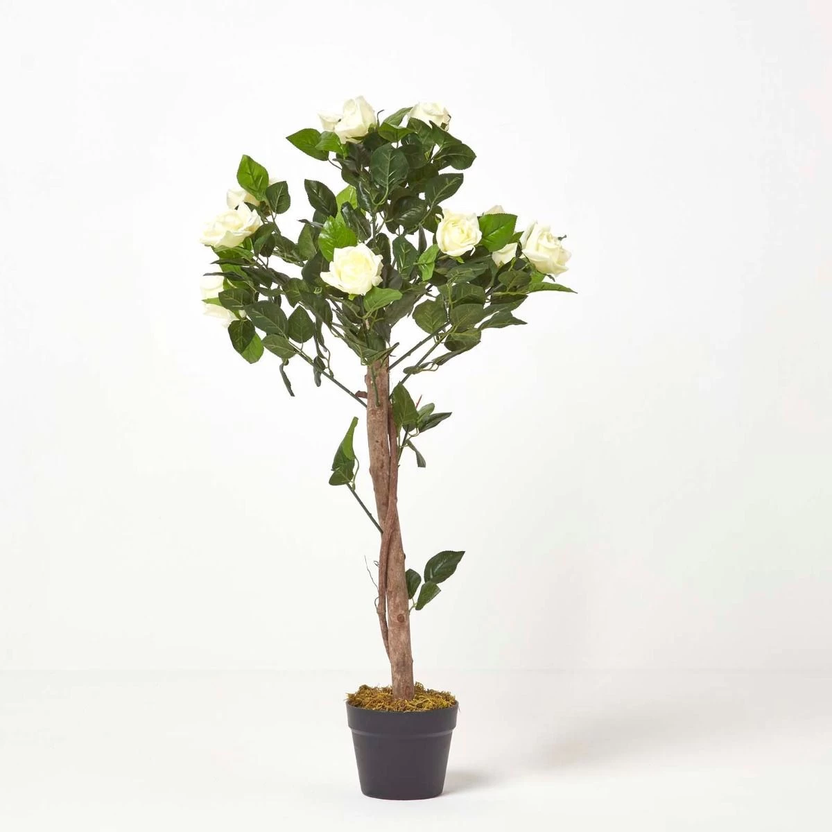 Adorned with rich, ivory-toned blooms, this topiary-style artificial rose bush is just the thing for those who love the look of plants but don’t have the time or environment to provide the care that living houseplants need. This true-to-life ornament is set in a simple plant pot, covered with imitation moss, from which a vine-wrapped, wood-look stem protrudes. At the top of the trunk, silk-polyester leaves create a ball-shaped structure that houses several white rose heads, creating a vibrant, natural appearance. For optimum presentation, place in a decorative planter to suit your decor.