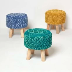 Add style to your home with the teal green rustic macrame footstool. Ideal for adding a splash of colour to your interior, this textured pouffe stands on four sturdy wooden legs and is finished with a flat-top. This makes it great for use as a side table, footstool and even an occasional seat.