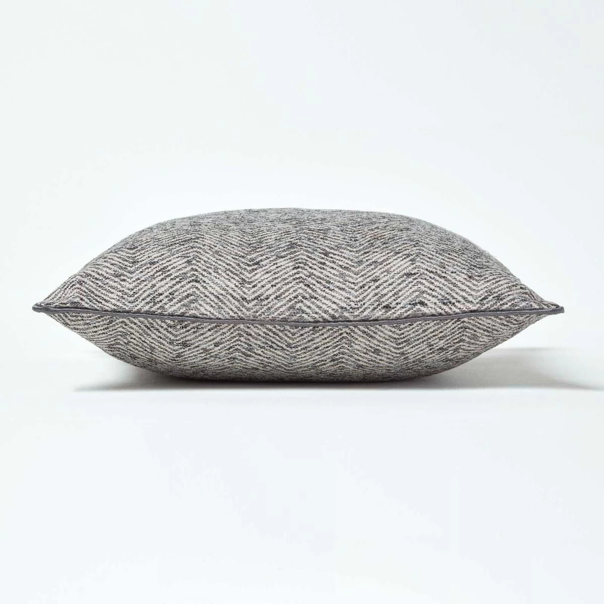 Grey textured cushion with chevron pattern design. This decorative cushion is jacquard woven and will add a touch of natural style and texture to your home. A versatile cushion that can be styled on sofas or beds it will complement both modern and traditional style living spaces.