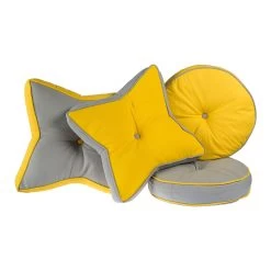 Yellow star shaped floor cushion with grey piping and sides, for indoor or garden use, this outdoor seat cushion is prefilled and covered with 100% cotton fabric.
