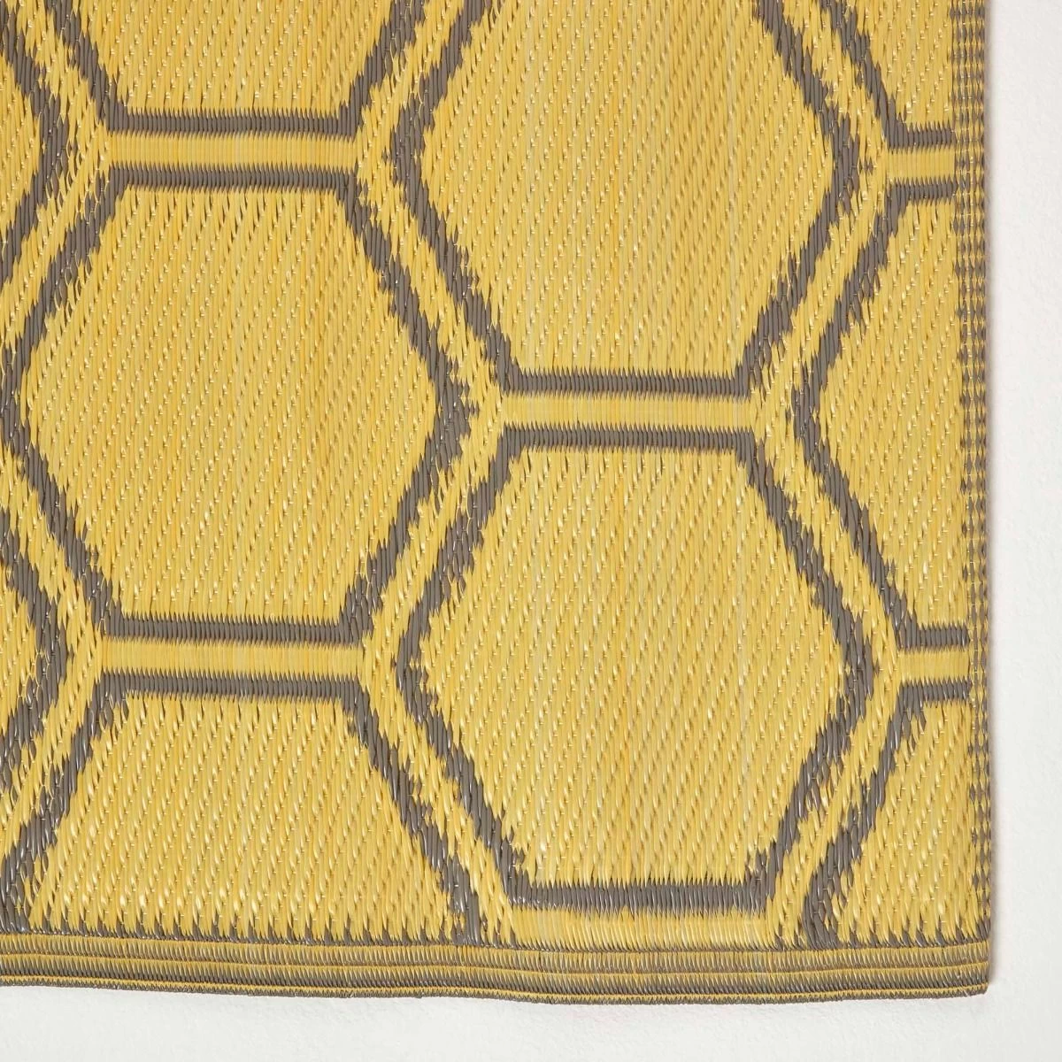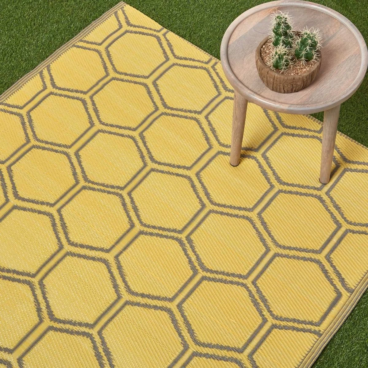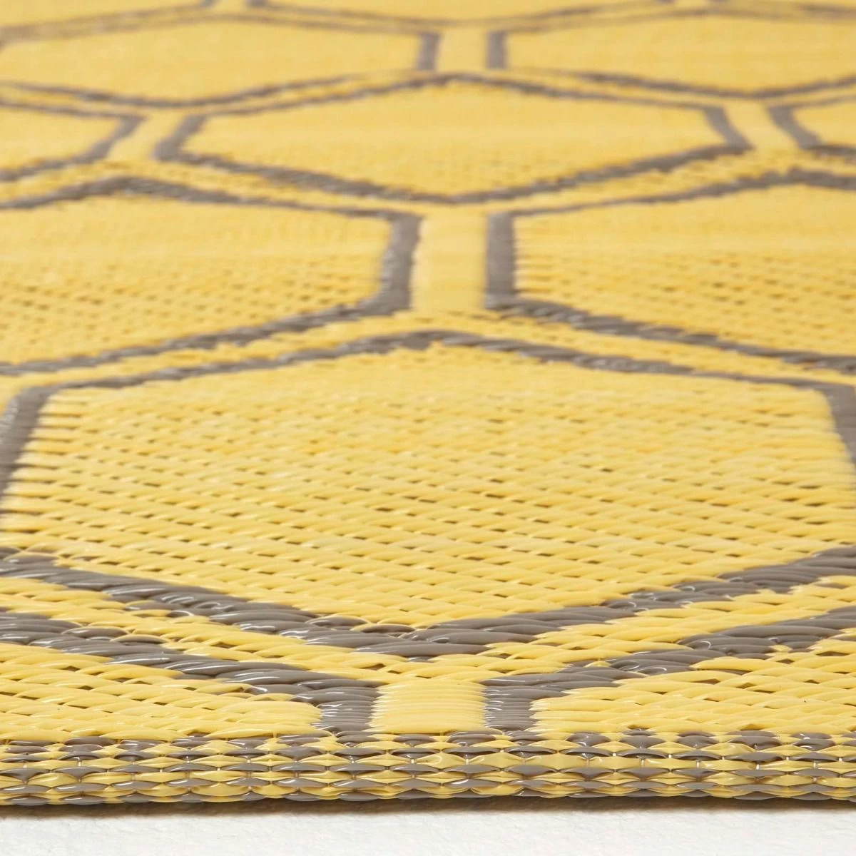 A reversible yellow outdoor rug that has been woven from 100% recycled polypropylene in a honeycomb pattern. It’ll feel like summer every day with this brightly coloured on-trend garden carpet. This low maintenance rug is easy to clean, and simply requires a spot-clean with a damp rag as needed. When your outdoor rug arrives, it will be rolled; leave front side down for 24 hours before first use to allow the rug to naturally flatten.