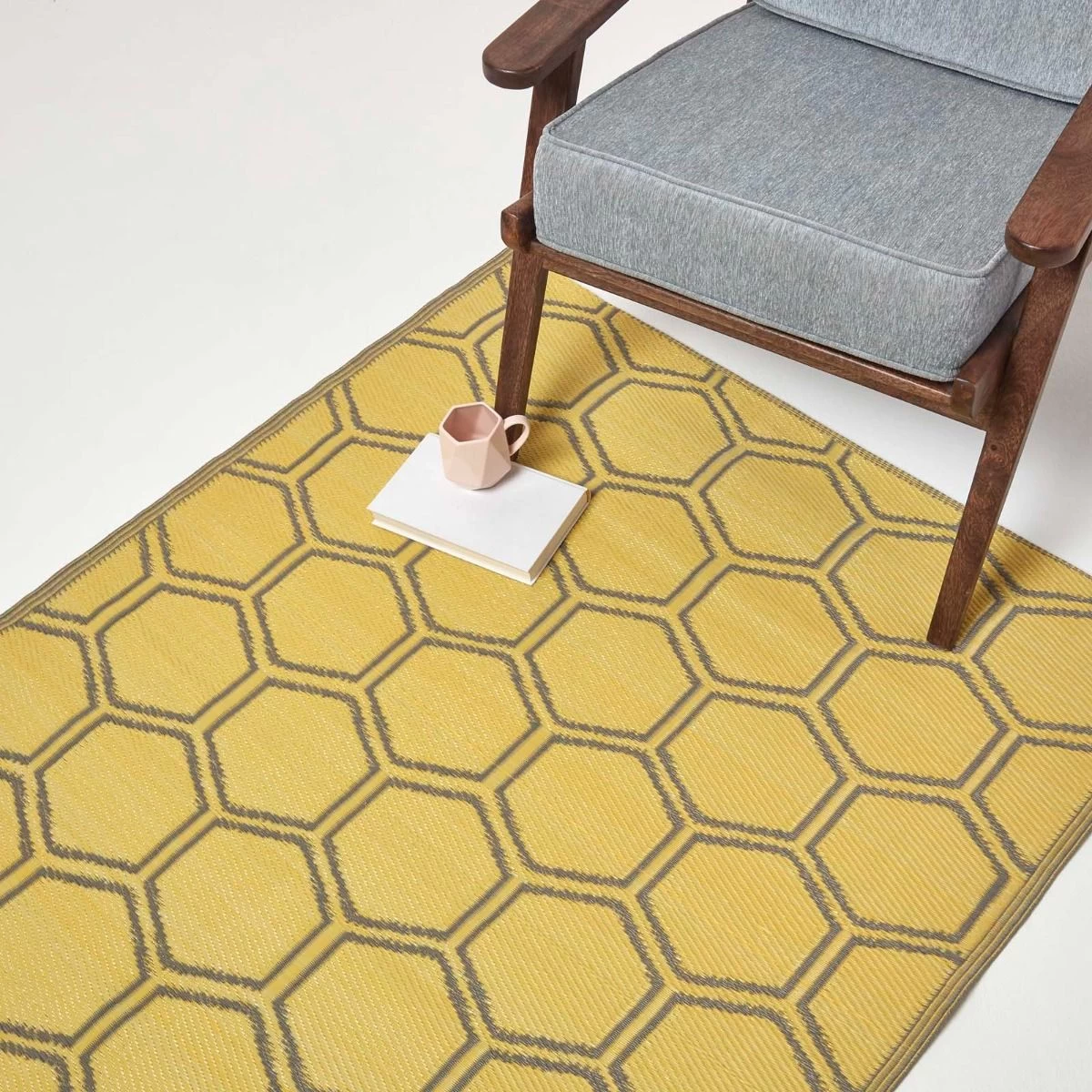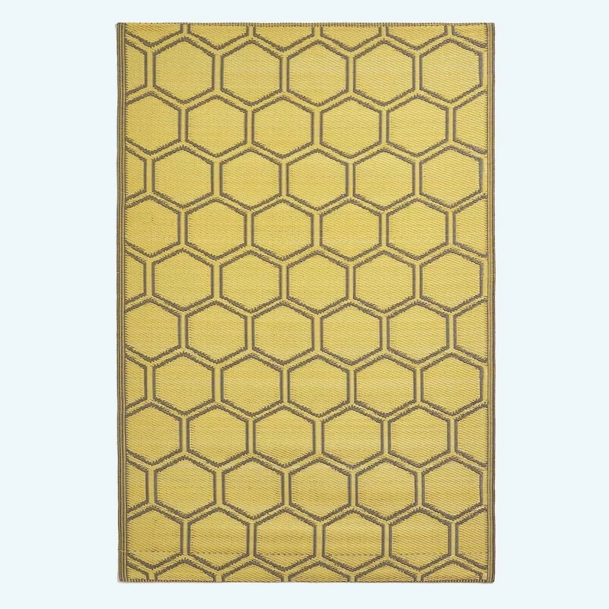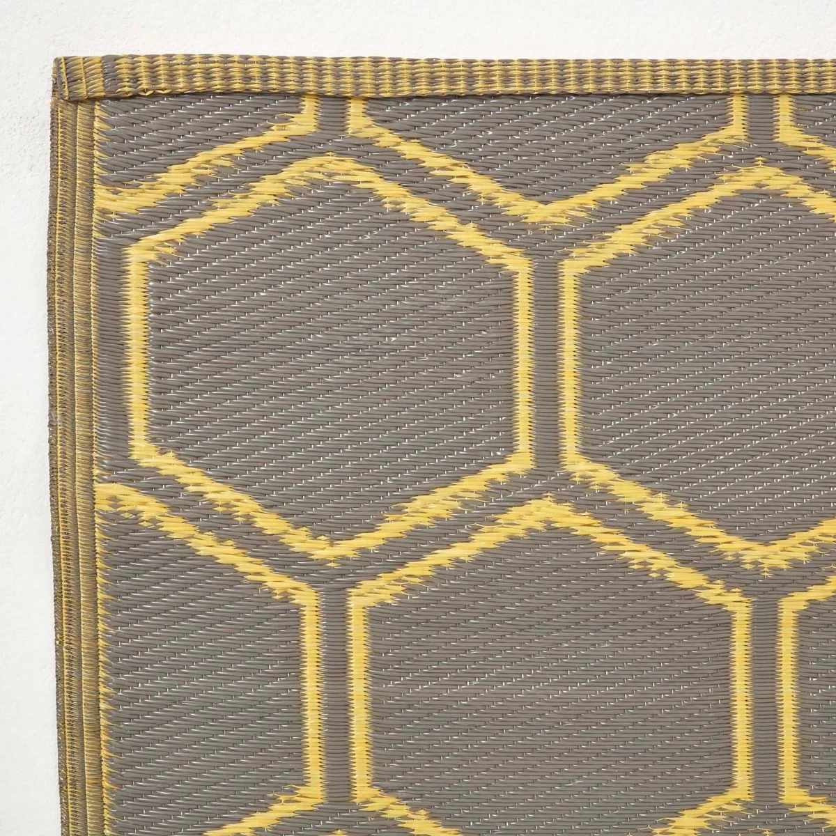 A reversible yellow outdoor rug that has been woven from 100% recycled polypropylene in a honeycomb pattern. It’ll feel like summer every day with this brightly coloured on-trend garden carpet. This low maintenance rug is easy to clean, and simply requires a spot-clean with a damp rag as needed. When your outdoor rug arrives, it will be rolled; leave front side down for 24 hours before first use to allow the rug to naturally flatten.