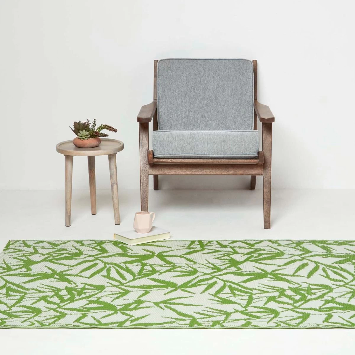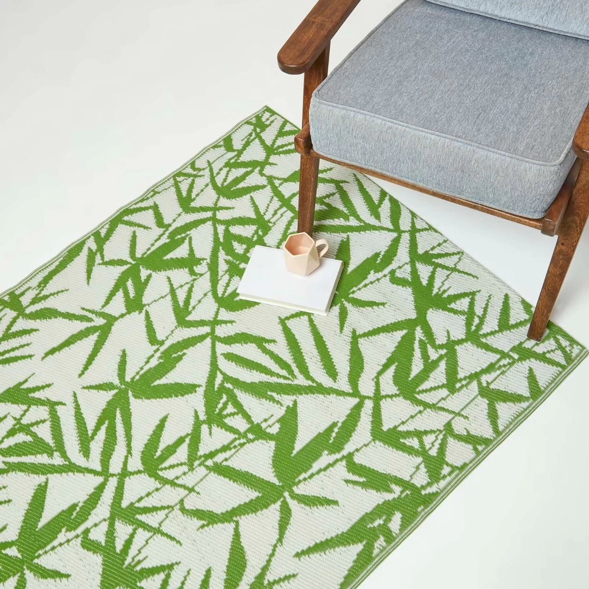 An on-trend outdoor rug ideal for all weathers and garden types. Woven from recycled polypropylene, this sustainable and contemporary white and green patio rug features a silhouette bamboo print – perfect for adding that botanical look to any space.