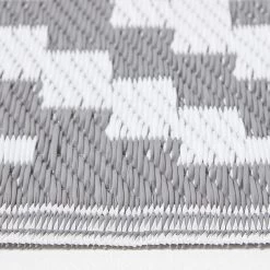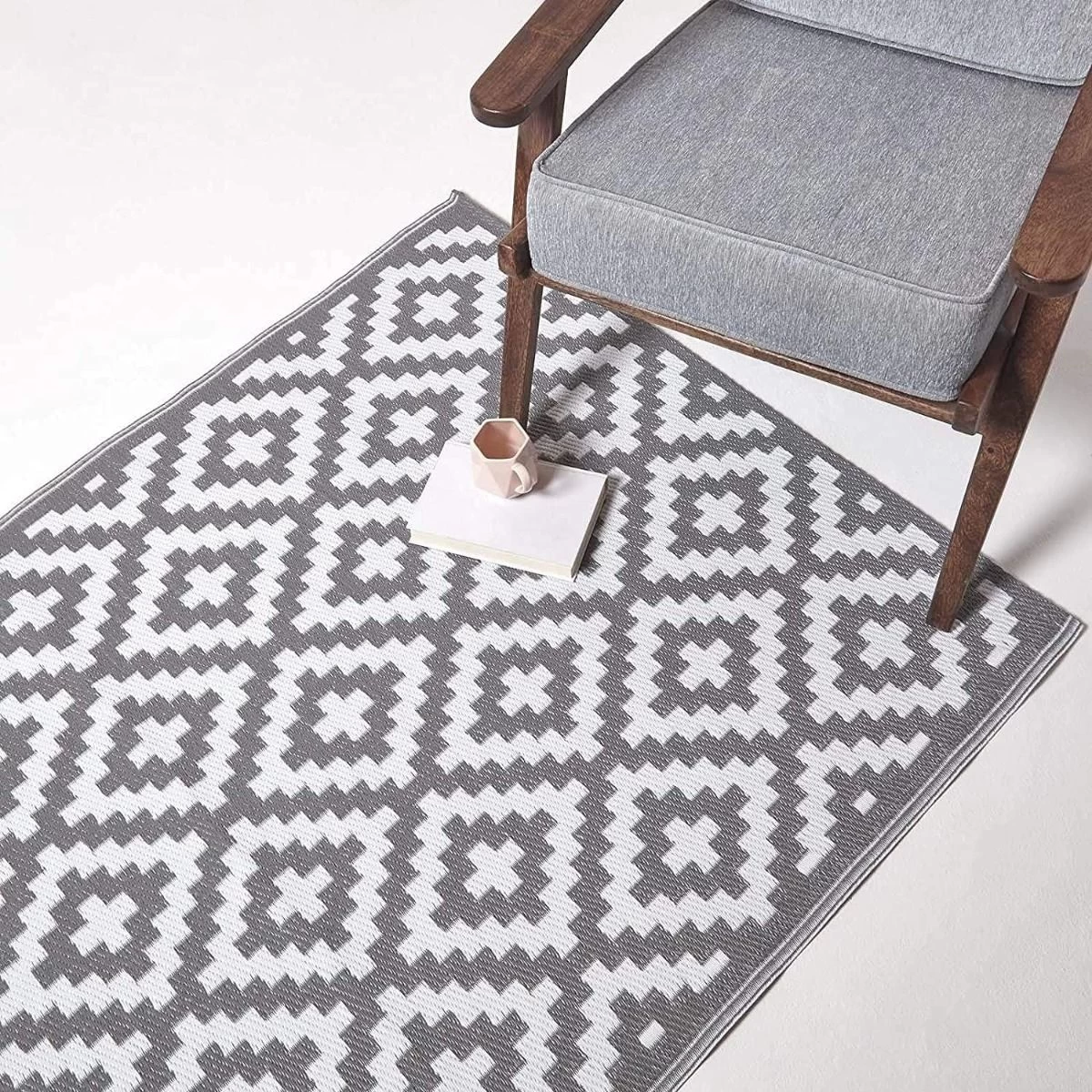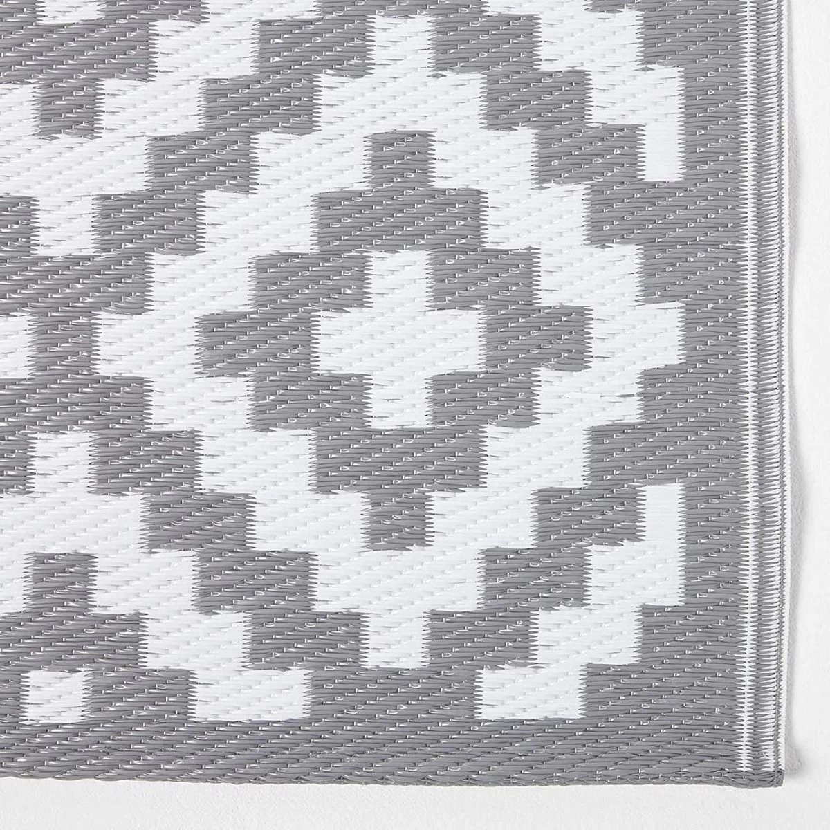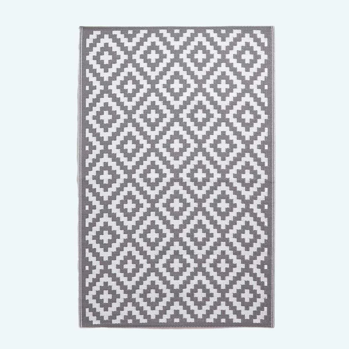White and grey outdoor rug from Homescapes, Geometric style garden rug with diamond pattern, woven from 100% recycled polypropylene, this rug is weather resistant.